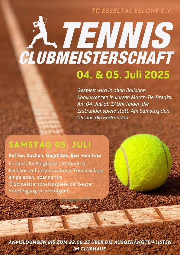 Die Clubmeisterschaften des TC Eslohe finden am kommenden Wochenende auf der Anlage in der Sormecke statt. Neu in diesem Jahr ist, dass das Turnier an zwei aufeinanderfolgenden Tagen in Turnierform gespielt wird. Dabei wird jeweils auf 2 Match-Tie-Breaks gespielt. Konkurrenzen sind Damen Einzel und Damen Doppel, Herren Einzel und Herren Doppel sowie im Mixed. Alle Clubmitglieder/Innen können sich noch für die Spiele anmelden. Bitte tragt Euch zügig in die Listen am Clubhaus ein. Die Erstrundenspiele finden am 4. Juli ab 17.00 Uhr statt. Am Samstag den 5. Juli werden die Spiele fortgesetzt. Am Abend startet im Clubhaus die große Playersnight. Zu der Veranstaltung sind alle Mitglieder/Innen, aber auch alle Freunde des Tennissports in Eslohe herzlich eingeladen. Für Kaffee, Kuchen, Gegrilltes und frisches Bier vom Fass ist gesorgt!